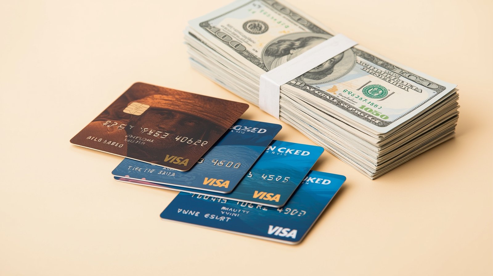 Clean financial scene with stacked credit cards, cash bundles